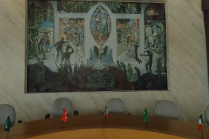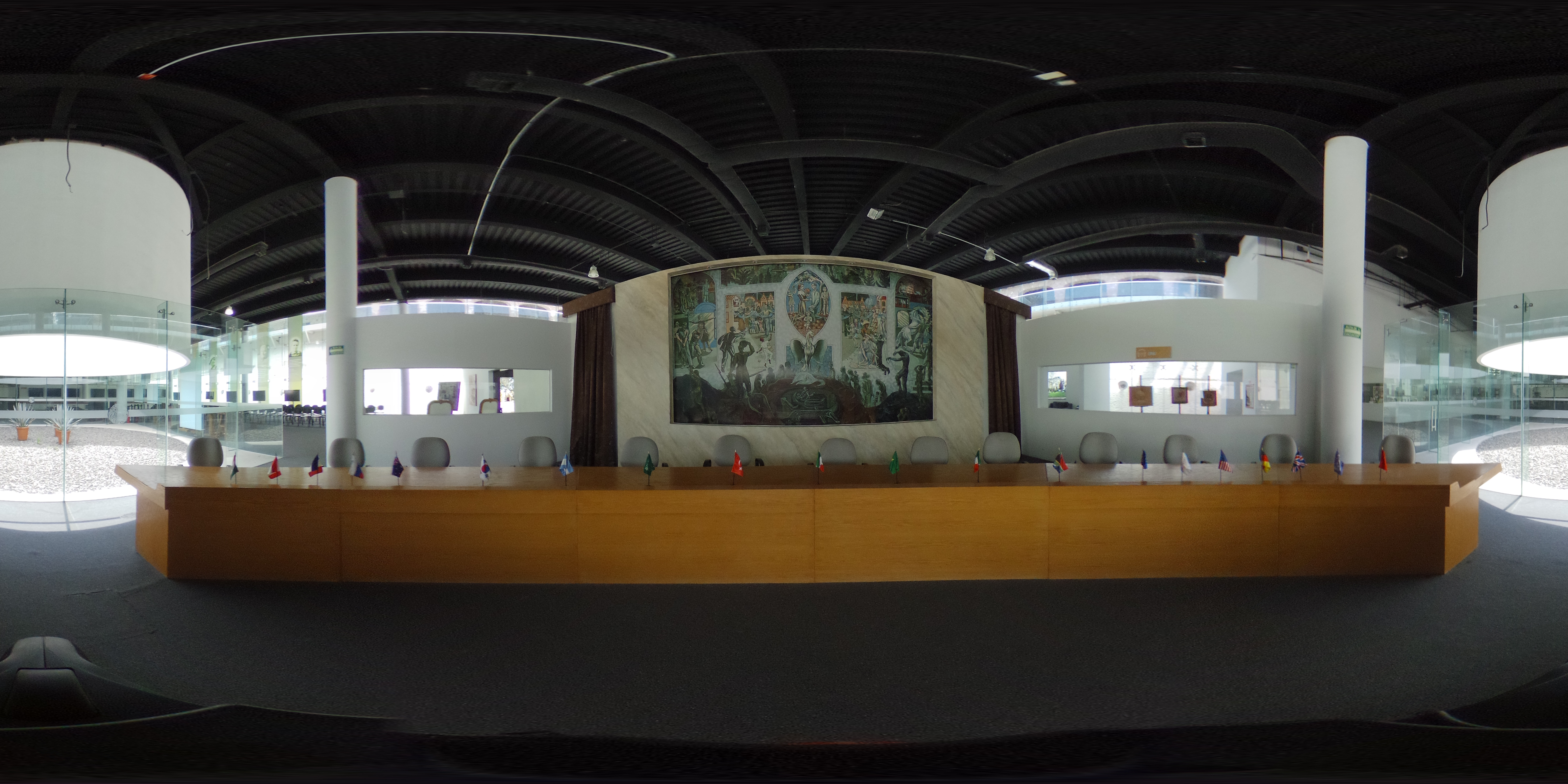 Sala donde se reúnen representantes de varios países, miembros de la ONU, para discutir temas sobre paz y seguridad a nivel mundial. El mural al fondo es del artista noruego Per Krohg, donado a la ONU en 1952.